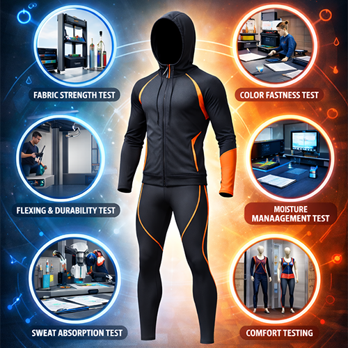 Lab testing for breathability, moisture-wicking, and colorfastness; raw material examination for fabric weight, color correctness, shrinkage, and stretch Pre-production trials and sample approvals.
